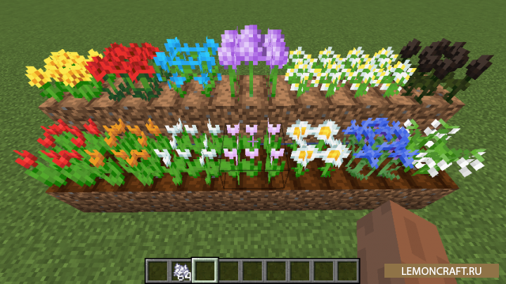 Мод на семена цветов Flower Seeds поможет вам если вы хотите устроить красивый цветущий участок у вас перед домом. Мод добавит в сетку крафта цветок и семена пшеницы нескольких цветов. Теперь вам нужно сажать цветы и получать семена. Чем больше вы получите семян, тем обширнее и красивее зацветет ваш участок. Так же из выросших растений вы сможете получить краситель.