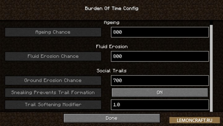 Мод на бремя времени Burden Of Time позволит вашему миру стареть без вашего участия. В вашем мире блоки начнут зарастать мхом, дорожки будут вытаптываться, а вода и лава будут "запекать" или делать треснувшие блоки, с которыми они были в контакте.