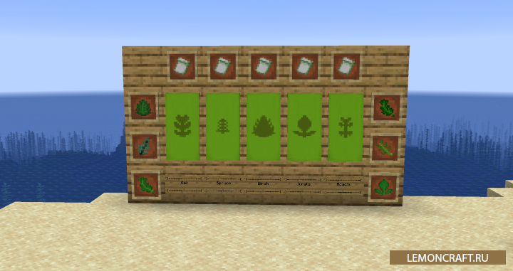 Мод на элементы листвы Leaf Items небольшая модификация, после установки которой если вы разрушите блоки листвы без ножниц, то то выпадут отдельные листья - 6 видов. Используя данные листья вы сможете создать новые флаги.